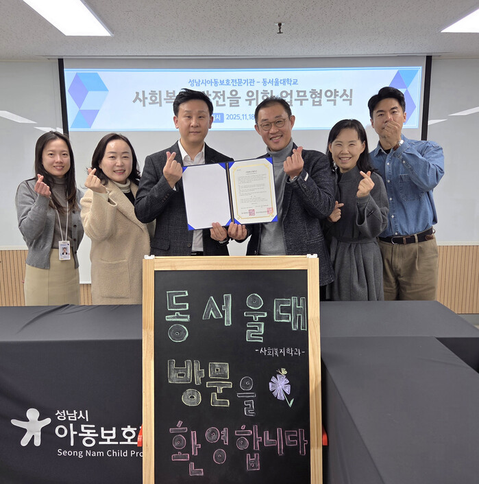 [성남=오왕석 기자] 성남시아동보호전문기관(관장 박동산)은 지난 18일, 동서울대학교 사회복지학과(학과장 이상철)와 성남시 사회복지 발전 및 종사자, 예비사회복지사 전문성 강화를 위한 업무협약을 체결했다고 밝혔다.
