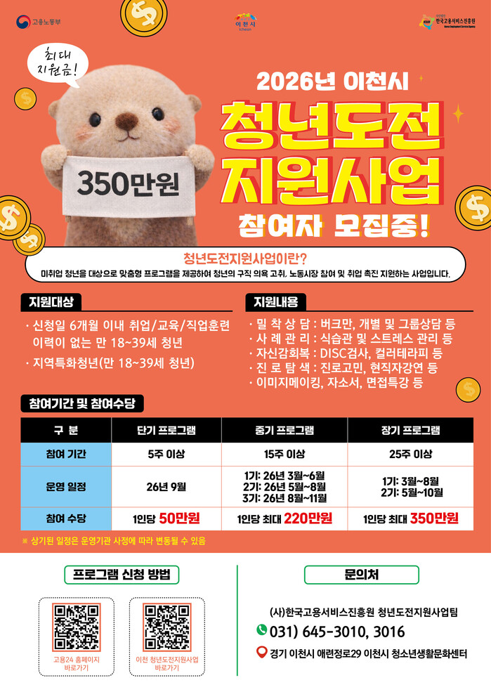 청년도전지원사업은 고용노동부와 이천시가 함께 추진하는 맞춤형 청년취업 지원사업으로, 장기간 구직활동에 어려움을 겪고 있는 청년들이 다시 노동시장에 진입할 수 있도록 돕는 프로그램이다.