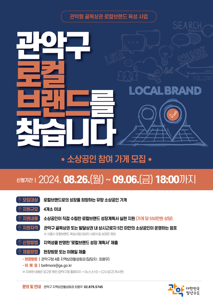[시민일보 = 문민호 기자] 서울 관악구(구청장 박준희)가 오는 9월6일 오후 6시까지 '로컬브랜드 육성 시법사업'에 참가할 소상공인을 모집한다.