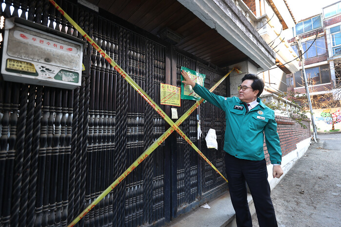 박일하 서울 동작구청장이 최근 노량진2동 노량진7 재정비촉진구역을 방문했다. 사진은 이날 박 구청장이 겨울철 이주구역 공가 및 공사장 안전관리 상황을 점검하고 있는 모습. (사진=동작구청 제공)