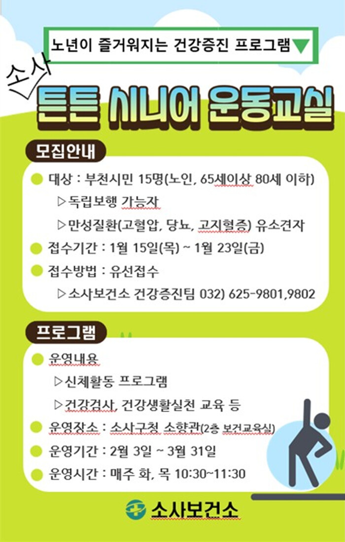 ‘튼튼 시니어 운동교실’은 소사보건소가 주관하는 건강증진 프로그램으로, 노화로 인해 저하되기 쉬운 근력을 유지하고 낙상 위험을 줄이기 위한 신체활동 중심으로 구성했다. 특히 만성질환을 앓고 있거나 질환 발생 위험이 있는 노인들을 위한 맞춤형 프로그램으로 운영한다.