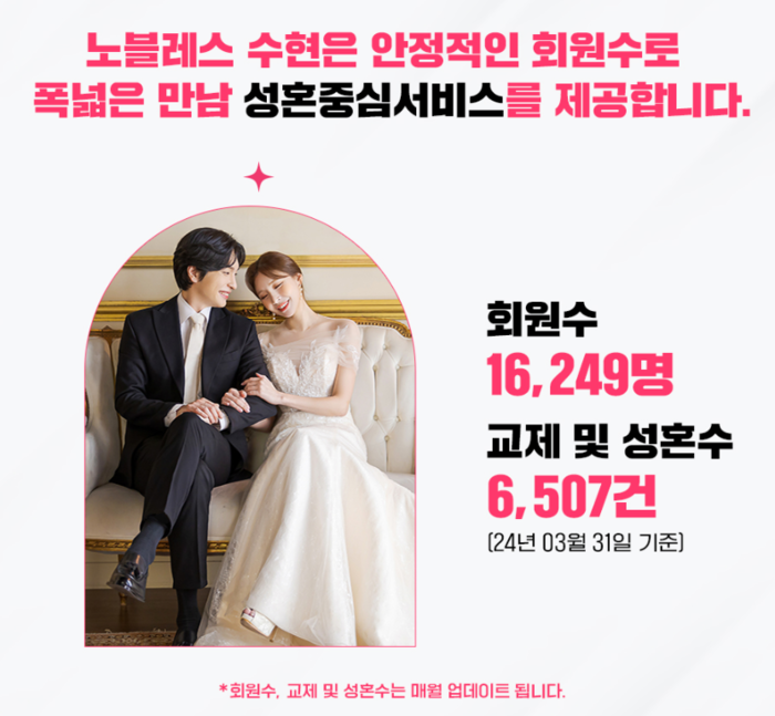 이번에 공개된 자료에 따르면 지난달 노블레스 수현의 전체 회원수는 16,249명, 교제·성혼 건수는 6,507명으로 전월대비 대폭 증가했다. 이는 서울 본사 이외에도 대전, 대구, 광주, 부산지사 내 회원을 모두 포함해 조사한 결과다.