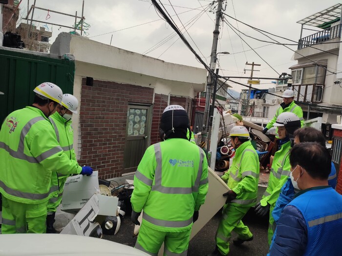 | ▲ 구 관계자들이 해당 어르신 가정의 폐기물을 수거하고 있다.(3.12.) (사진=종로구청 제공) |