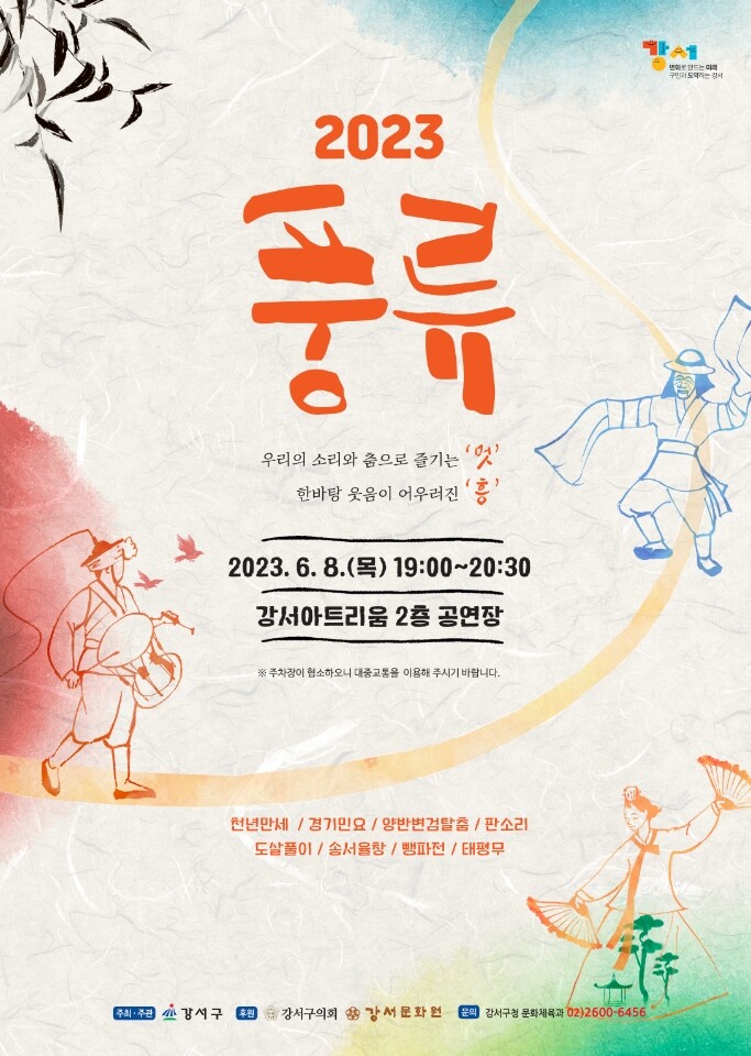 [시민일보 = 홍덕표 기자] 서울 강서구가 8일 강서아트리움 2층 공연장(아리홀)에서 전통문화예술 공연 '2023 풍류'를 개최한다.