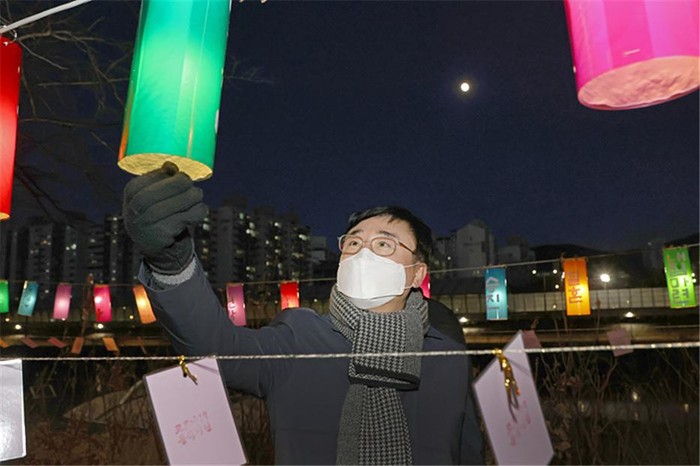 도봉구가 2022년 임인년 정월대보름을 맞아 비대면 전시 방식으로 14~20일 중랑천 서원아파트 구간에서 소망·건강·행복을 기원하는 소원 등(燈)을 전시했다. 사진은 15일 중랑천변에서 이동진 구청장이 정월대보름 소원 전시를 둘러보고 있는 모습. (사진제공=도봉구청)
