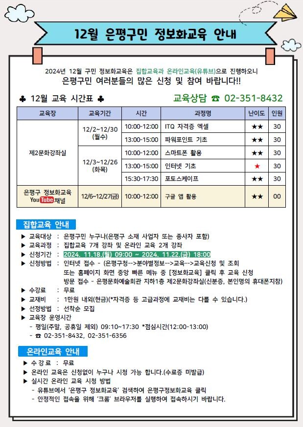 오프라인 교육은 내달 2일부터 월요일, 수요일 수업과 화요일, 목요일 수업으로 열린다. 선착순으로 모집하며, 매주 금요일에 열리는 온라인 교육은 별도의 신청 없이 누구나 ‘은평구 정보화교육’ 유튜브 채널에서 시청 가능하다.