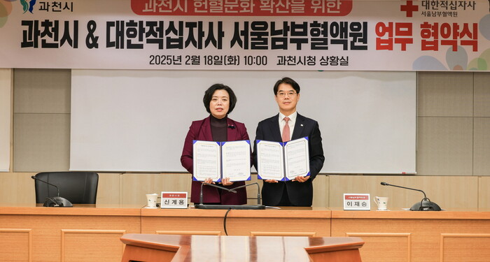 경기 과천시가 18일 시청 상황실에서 대한적십자사 서울남부혈액원과 헌혈문화 확산 및 혈액수급 안정화를 위한 업무협약을 체결했다. 사진은 신계용 시장(왼쪽)과 이재승 서울남부혈액원장(오른쪽)이 협약식 후 기념 촬영을 하는 모습. (사진=과천시청 제공)