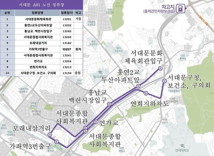 31일 구에 따르면 노선은 가좌권역과 서대문구청 간 대중교통 연계성을 보완해 구청, 보건소, 홍제폭포, 안산(鞍山), 문화체육회관, 청소년센터, 서대문종합사회복지관, 모래내시장, 가좌역 등을 직·간접적으로 연결한다.