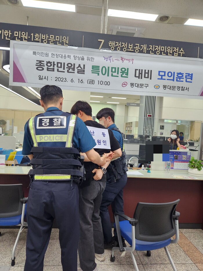 [시민일보 = 이대우 기자] 동대문구(구청장 이필형)가 최근 ‘특이민원 대비 모의훈련’을 경찰관 참관 하에 구청 1층 종합민원실에서 실시했다.