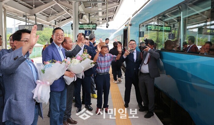 | ▲ 박지원 국회의원과 명현관 해남군수, 이성옥 해남군의장 등이 지난 27일 처음 개통된 해남역에서 첫 도착한 여행객들에게 손을 흔들며 환영 인사를 하고 있다. / 해남군 제공 |