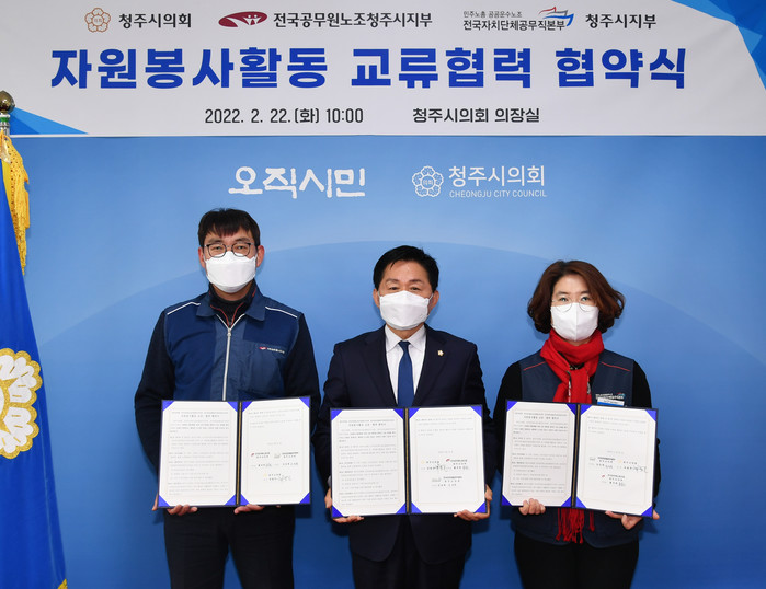 청주시의회(의장 최충진)와 전국공무원노조청주시지부(지부장 류재홍), 전국자치단체공무직본부청주시지부(지부장 강성옥)는 22일(화) 시민을 보호하고 깨끗한 청주시를 만들기 위한 자원봉사활동 업무협약을 체결, 상호협력체계를 구축했다.