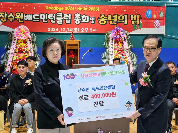 경기 의정부시 호원1동주민센터가 최근 장수원 배드민턴클럽으로부터 취약계층을 위한 성금 40만원을 전달 받았다. 사진은 기부금 전달식에 참석한 관계자들이 기념 촬영을 하는 모습. (사진=의정부시청 제공)
