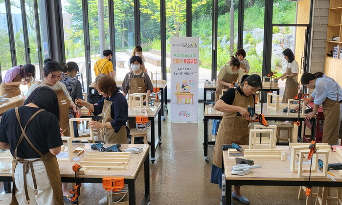 | ▲ 드림스타트 부모힐링 프로그램으로 목공체험을 하고 있다. (사진=구로구청 제공) |