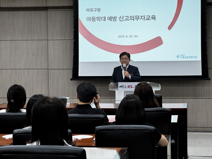[시민일보 = 문민호 기자] 서울 마포구(구청장 박강수)는 최근 구청 시청각실에서 아동복지시설 종사자, 사회복지전담공무원 등 50여명을 대상으로 ‘2025년 아동학대 신고의무자 교육’을 진행했다고 30일 밝혔다.