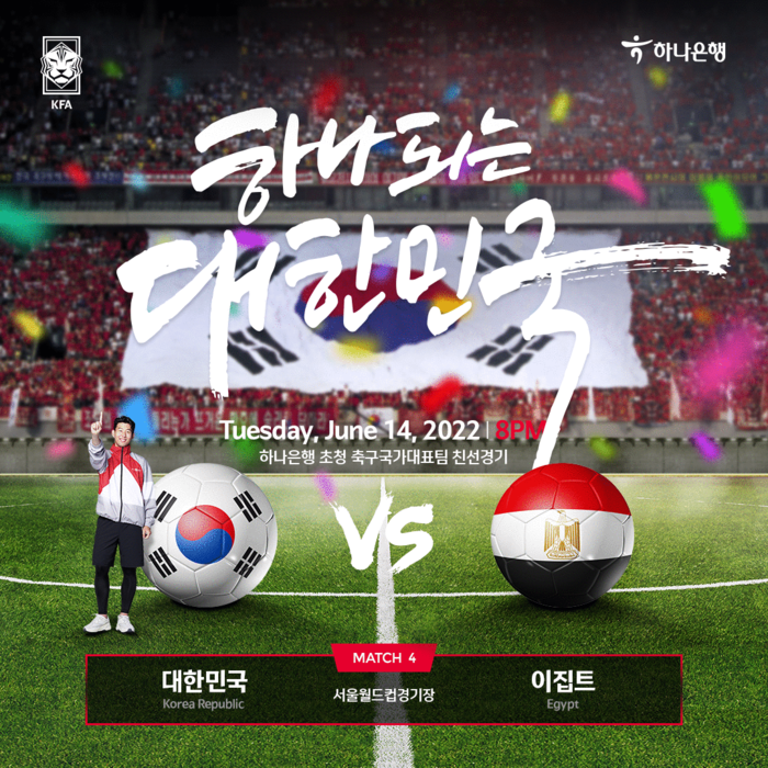[시민일보 = 여영준 기자] 하나은행은 모바일 앱 하나원큐를 통해 오는 14일 서울월드컵경기장에서 열리는 하나은행 초청 대한민국 축구국가대표팀 친선 마지막 경기인 이집트전 입장권 예매 서비스를 9일 오후 5시에 오픈한다고 밝혔다.