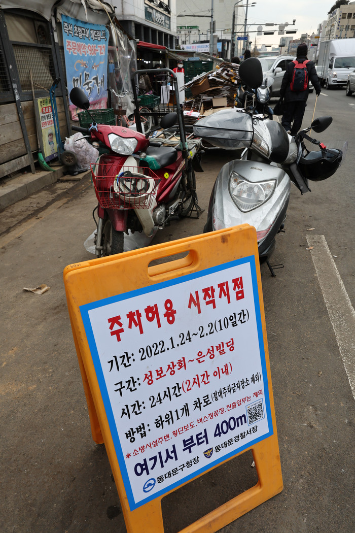 설 연휴를 앞둔 24일 오후 서울 동대문구 경동시장 인근에 주차허용 관련 안내판이 세워져 있다.