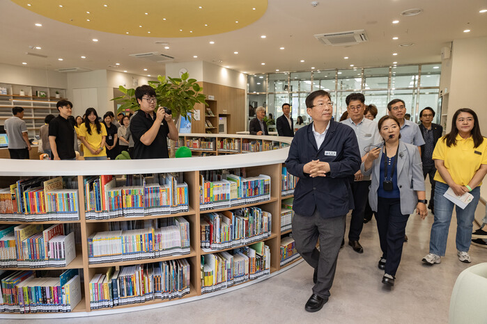 | ▲ 김경호 구청장(맨 앞)이 어린이영어도서관 시설을 관람하고 있다. (사진=광진구청 제공) |