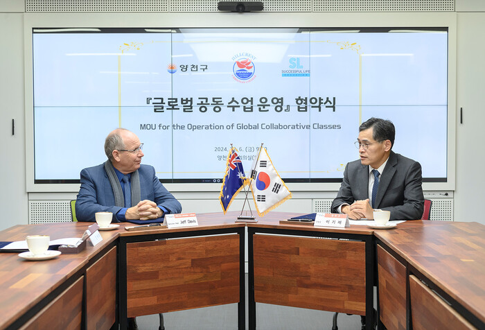 | ▲ 지난 6일 ‘글로벌 공동 수업 운영’ 협약식에서 이기재 구청장(오른쪽)과 호주 Hillcrest College 총장이 이야기를 나누고 있다. (사진=양천구청 제공) |
