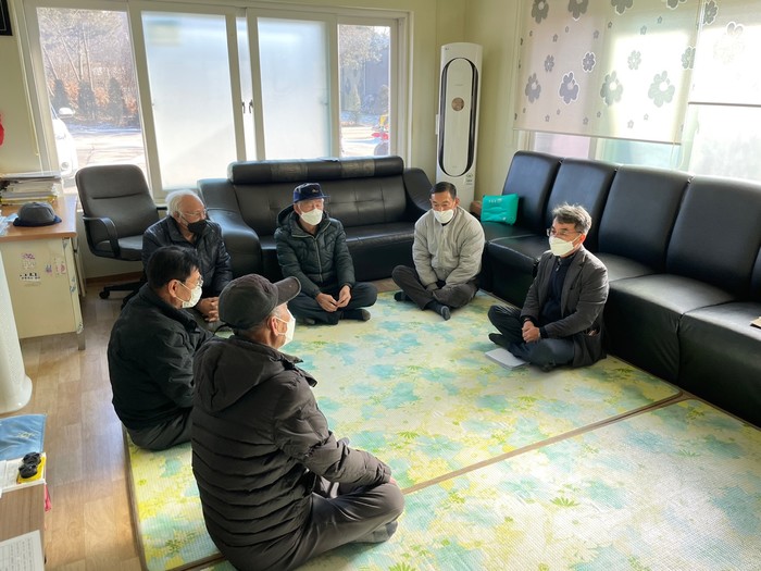 경기 포천시 영중면사무소가 새해를 맞아 최근 영중면 지역내 경로당 19곳을 방문해 시설을 둘러보며 애로사항과 건의사항을 청취하고 2022년 보조금 집행 방법 등을 안내했다. 사진은 면 관계자가 경로당을 방문해 노인들과 대화를 나누고 있는 모습. (사진제공=포천시청)