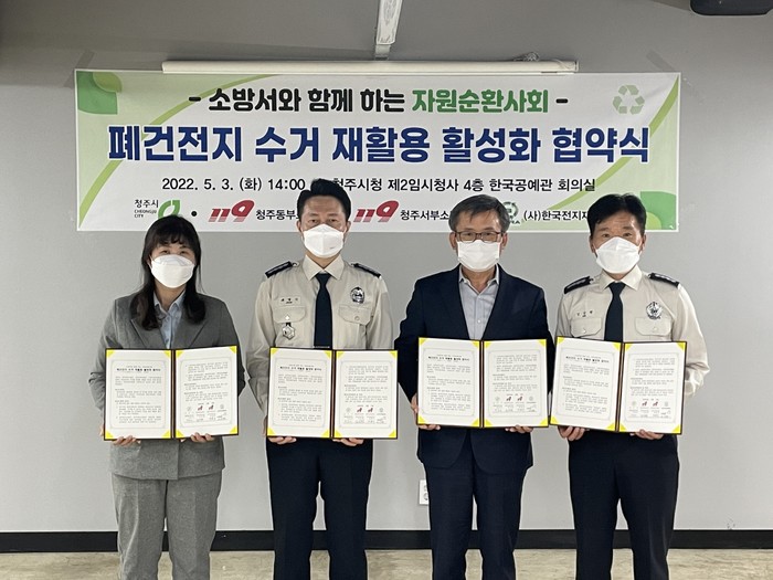 청주시가 지난 3일 청주시청 제2임시청사 회의실에서 청주동부소방서(서장 김상현), 청주서부소방서(서장 채열식), (사)한국전지재활용협회(사무국장 이시정)와 환경 보호를 위해 폐건전지 수거 재활용 활성화를 위한 업무협약을 체결했다.