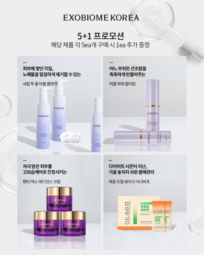 이번 프로모션은 ▲세럼 투 폼 버블 클렌저 ▲퍼플 파워 멀티밤 ▲펜타 엑소 래디언스 크림 ▲헬스&이너뷰티 브랜드 헬시엑소의 체중 조절 쉐이크 이너바프 제품들로 구성되며, 각 제품 5ea 구매 시 1ea가 증정되는 프로모션으로 회원할인까지 적용 시 더욱 저렴한 가격으로 제품을 구매할 수 있다.