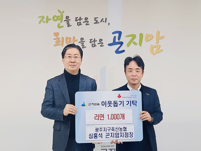 광주지구축산농협 심흥석 곤지암지점장이 19일 경기 광주시 곤지암읍을 방문, 어려운 이웃들에게 전달해 달라며 라면 1000개를 기탁, 따뜻한 마음을 전했다. 사진은 기탁식에서 관계자들이 기념촬영을 하는 모습. (사진=광주시청 제공)
