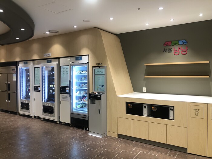 해당 공간에는 신선식품(샐러드, 도시락 등)과 다양한 음료, 냉동식품을 판매하는 멀티자판기 ‘서초 냠냠’ 3대를 설치하고, 구매 후 바로 섭취할 수 있도록 전자레인지와 테이블도 구비했다.