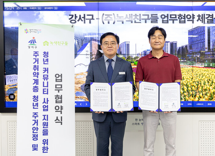 [시민일보 = 박소진 기자] 강서구(구청장 진교훈)가 최근 (주)녹색친구들과 '주거 취약계층 청년의 주거안정 및 청년 커뮤니티 사업 지원' 업무 협약을 체결했다.