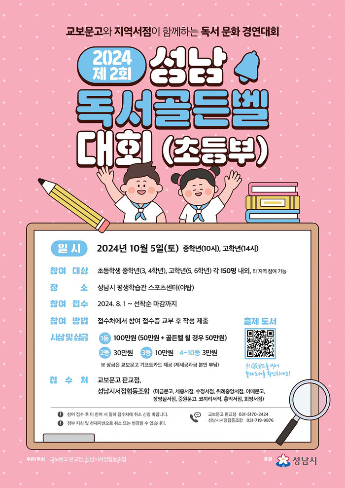 대회에 참가하려는 초등 3~6년생은 교보문고 판교점, 미금문고, 세종서점, 수정서점 등 11곳의 지역 내 서점 접수처를 방문해 선착순으로 신청하면 된다.