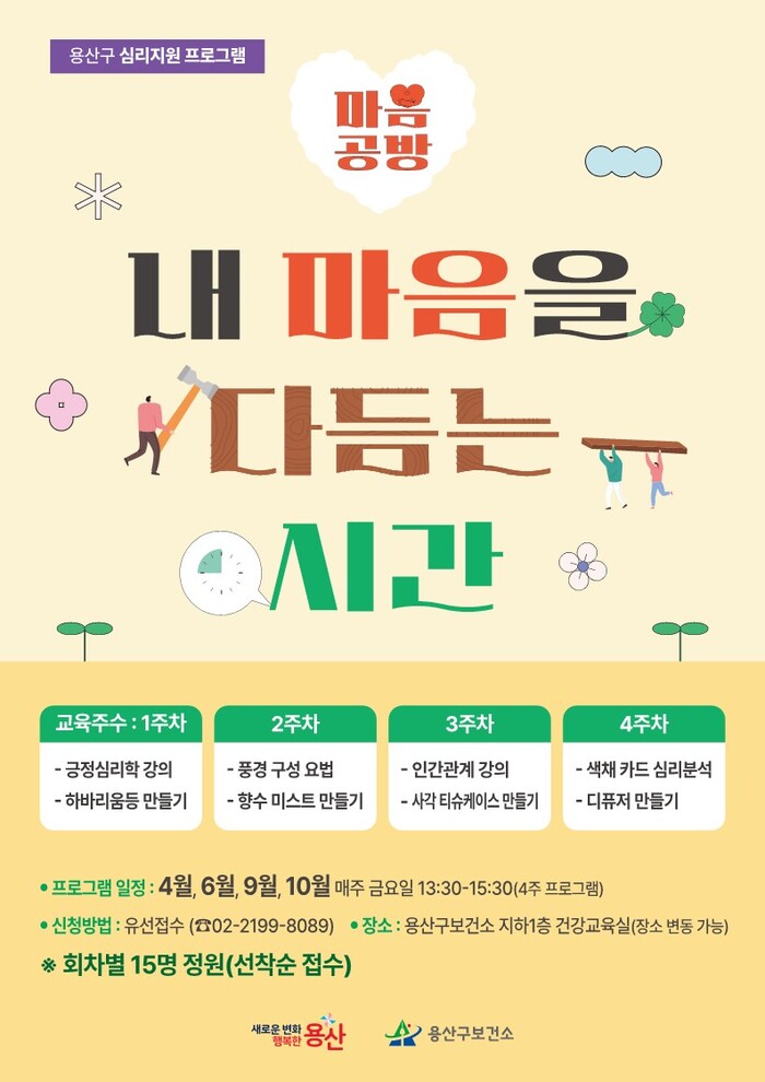 [시민일보 = 변은선 기자] 서울 용산구(구청장 박희영)는 이달부터 구보건소 지하 1층 건강교육실에서 청·장년을 대상으로 집단 심리 치유프로그램 ‘마음공방(내 마음을 다듬는 시간)’을 운영하고 있다고 밝혔다.