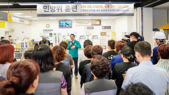 충남 서산시는 지난 22일 공습 상황 발생시 대응 역량을 강화하기 위해 을지연습과 연계한 공습 대비 민방위 훈련을 실시해 주민 대피 등 다양한 상황을 가정하고 진행했다. 사진은 이날 이마트 서산점에서 진행된 민방위 훈련에서 이완섭 시장이 발언을 하고 있는 모습.(사진=서산시청 제공)