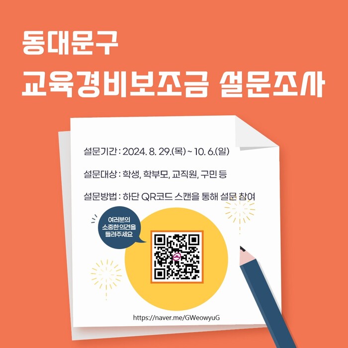 조사 내용은 교육경비보조금 지원 현황에 대한 만족도와 개선사항, 중점 지원 프로그램에 대한 의견수렴 등을 포함하고 있다. 동대문구 교육 발전에 관심 있는 학생(학부모), 교직원, 일반 주민 누구나 참여할 수 있다.