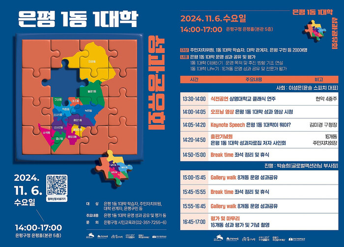 은평1동-1대학 성과공유회 참여를 희망하는 분들은 해당 포스터의 큐알(QR) 코드를 통해 사전등록이 가능하며, 당일에 현장 참여도 가능하다.