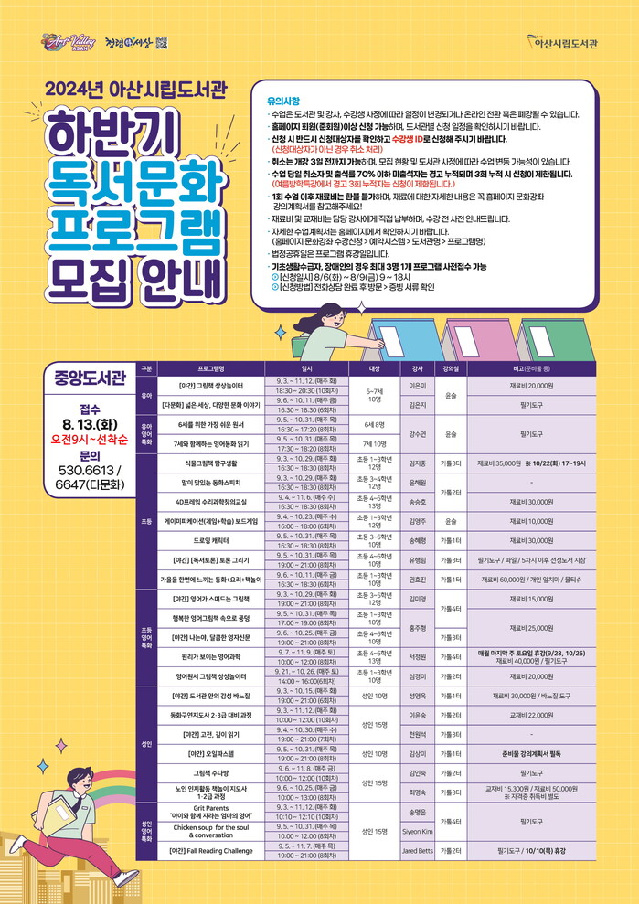 이번 프로그램은 유아부터 성인까지 다양한 연령대를 대상으로 독서 기반 프로그램과 취미 강좌, 전문자격 취득과정 및 특화프로그램(중앙 영어ㆍ배방 여가ㆍ탕정온샘 웹툰ㆍ꿈샘 영상) 등 64개(501회)의 다채로운 강좌로 운영된다.