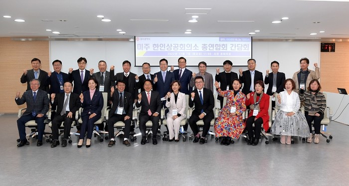 | ▲ 강기정 광주광역시장(앞줄 왼 쪽부터 5번)이 7일 오전 시청 중회의실에서 미주 한인상공회의소 총연합회 임원단과 만나 중소기업·스타트업 해외 판로 개척 및 수출 확대, 투자 지원 방안 등을 논의한 후 기념촬영을 하고 있다./광주광역시 제공 |