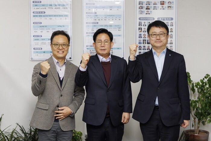 | ▲ 박강수 구청장(가운데)이 도화동 특별신용보증 현장접수처를 둘러본 후 주민센터에서 우리은행 기관그룹 조세형 부행장(오른쪽), 서울신용보증재단 마포지점 최명진 지점장(왼쪽)과 기념촬영을 하고 있다. (사진=마포구청 제공) |