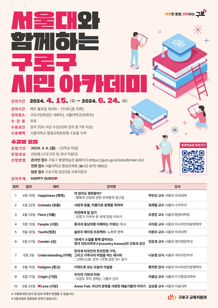이번 아카데미는 4월 15일부터 6월 24일까지 구로구민회관 대강당에서 매주 월요일 저녁 7시부터 2시간 동안 진행한다. ‘HAPPY GURO♡’라는 강의 테마로 행복, 사랑, 종교 등 회차별 다양한 주제로 알차게 구성했다.