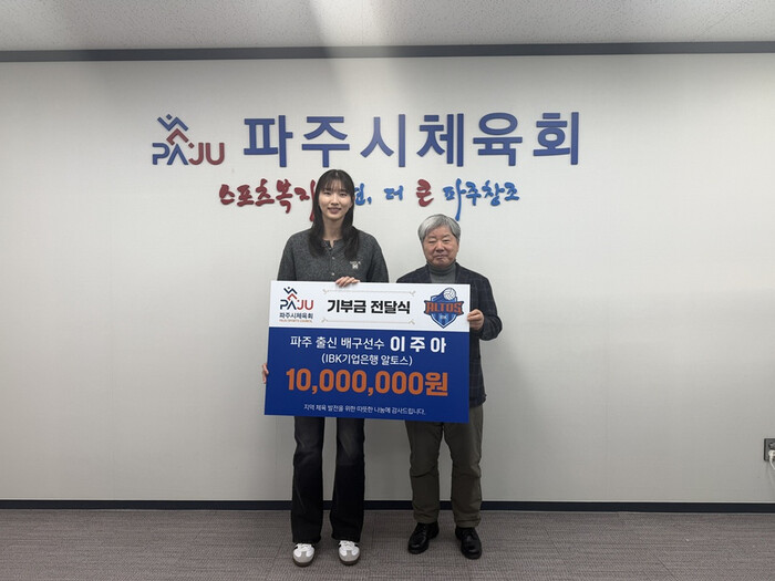 이주아 선수는 “고향 파주에서 많은 응원과 도움을 받으며 운동을 시작했고, 덕분에 지금의 자리까지 올 수 있었다”라며 “지역 체육 발전과 후배 선수들에게 작게나마 힘이 되고자 기부를 결심하게 됐다”라고 소감을 밝혔다.