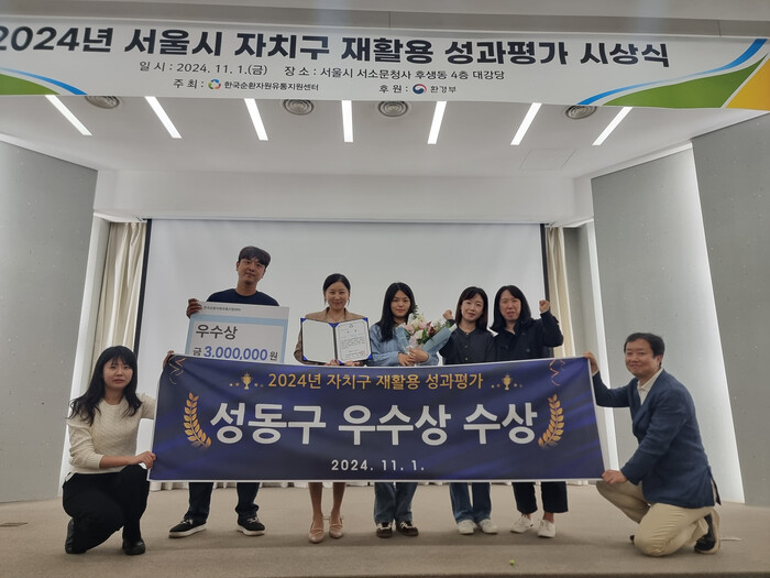 서울 성동구가 최근 서울시청 서소문청사 후생동 대강당에서 열린 ‘2024 서울시 자치구 재활용 성과평가 시상식’에서 우수상을 수상했다. 이번 시상식은 서울시 25개 자치구를 대상으로 자원순환 실적을 평가해 우수한 성과를 달성한 자치구에 대한 격려와 모범 사례 공유를 위해 마련됐다. 사진은 수상 후 구 관계자들이 기념 촬영하는 모습. (사진=성동구청 제공)