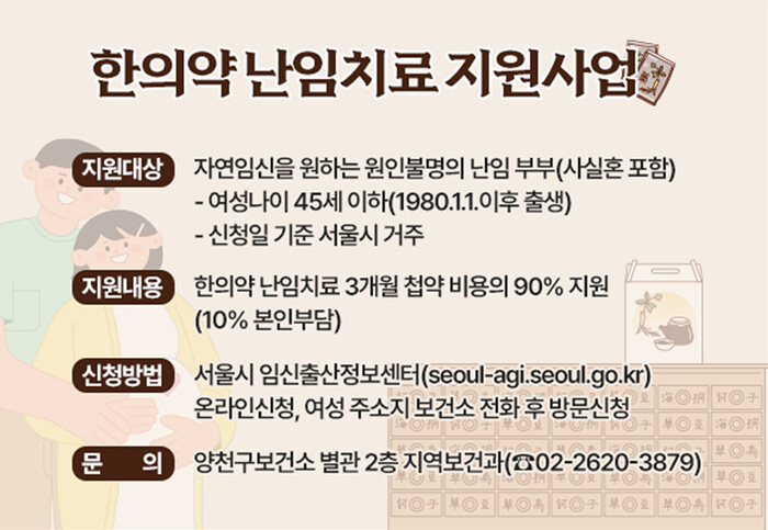 구는 저출산 위기 극복과 난임부부의 경제적 부담 완화를 위해 양천구 한의사회와 함께 ‘한의약 난임치료 지원사업’을 운영하고 있다.