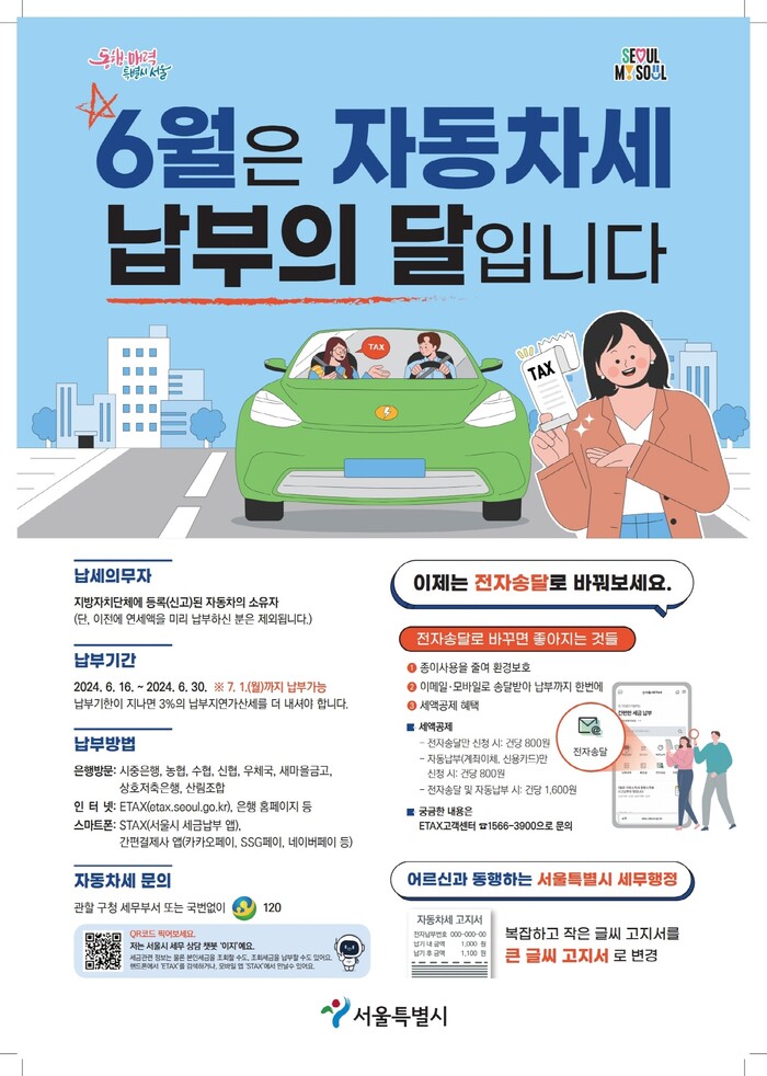 납부는 이달 16일부터 다음 달 1일까지 금융기관을 통해 고지서 전용계좌로 납부하거나 서울시 세금납부 앱(STAX), 서울시 지방세 온라인 납부시스템(ETAX), ARS로 편리하게 납부할 수 있다.