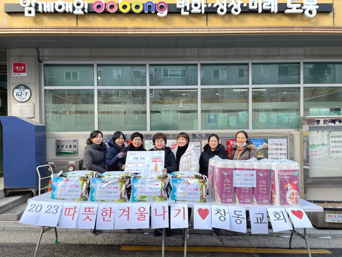 서울 도봉구 쌍문4동은 최근 창동교회로부터 ‘2023 희망온돌 따뜻한 겨울나기’ 성품 쌀 10kg 50포대와 휴지 50개 등 250여만원어치의 성품을 전달받았다. 사진은 전달식에서 관계자들이 기념촬영을 하고 있는 모습. (사진제공=도봉구청)