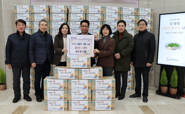 경기 과천시 중앙동이 최근 은파교회로부터 설 명절을 맞아 쌀국수 1200개를 기부받았다. 기부받은 쌀국수는 중앙동과 부림동의 저소득층 주민들에게 전달될 예정이다. 사진은 기탁식에서 관계자들이 기념 촬영을 하는 모습. (사진=과천시청 제공)