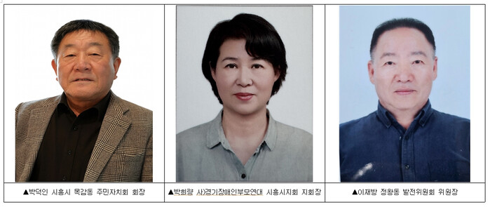 [시흥=송윤근 기자] 경기 시흥시가 올해 시민대상 수상자로 ‘박덕인(시흥시 목감동 주민자치회 회장), 박희량((사)경기장애인부모연대 시흥시지회 지회장), 이재방(정왕동 발전위원회 위원장)’ 3인을 선정했다(가나다 순).