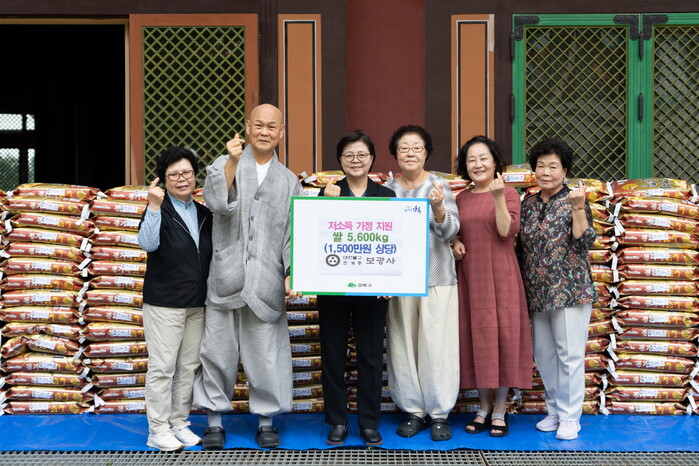 이순희 서울 강북구청장이 지난 22일 우이동에 소재한 보광사로부터 저소득가정을 위한 사랑의 쌀 5600kg(1500만원 상당)을 전달받았다. 사진은 전달식에서 이 구청장(왼쪽 세번째)이 관계자들과 기념촬영을 하고 있는 모습.(사진=강북구청 제공)