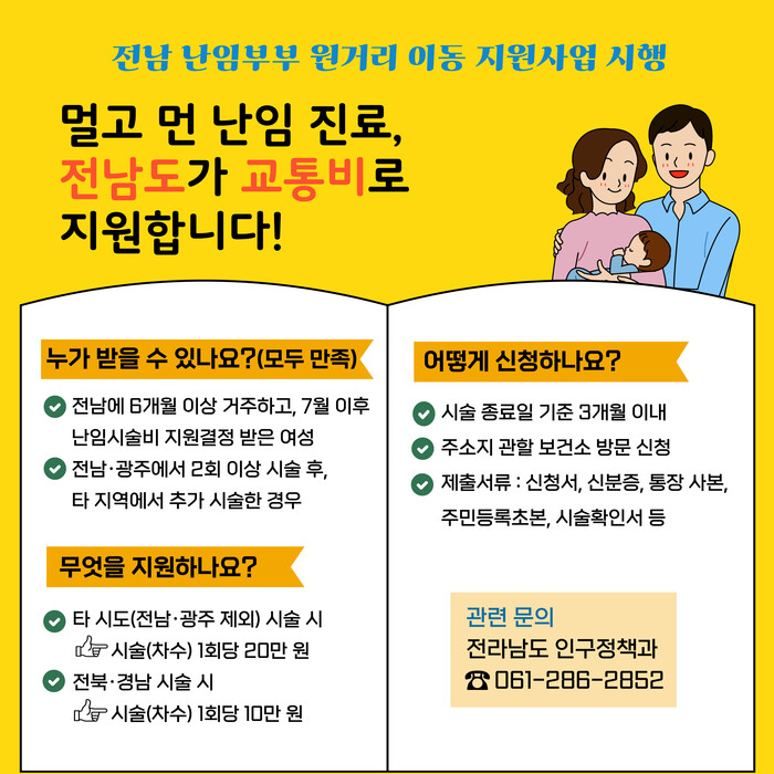 사업은 전남지역에서 시술에 실패해 불가피하게 타 시ㆍ도 의료기관에서 시술받은 경우 시술 차수 1회당 교통비를 전북ㆍ경남 지역은 10만원, 그 외 지역은 20만원을 지원한다.