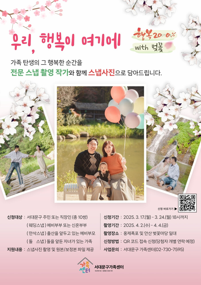 [시민일보 = 이대우 기자] 서울 서대문구(구청장 이성헌) 서대문구가족센터가 ‘우리, 행복이 여기에 with 벚꽃’ 사업을 추진한다.
