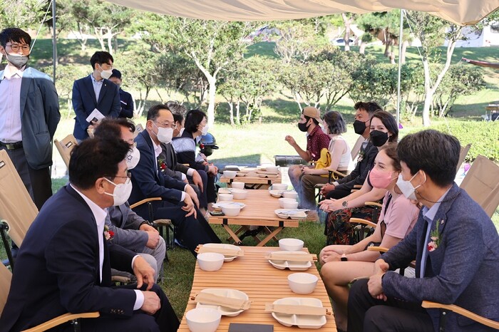 | ▲ 명현관 해남군수가 지난 2022년 8월 26일(28일까지 3일간) 오시아노 관광단지에서 열린 캠핑관광박람회에 참석해 박람회 관계자 및 외국인 방문객들과 차담을 나누고 있다. / 자료사진=해남군 제공 |