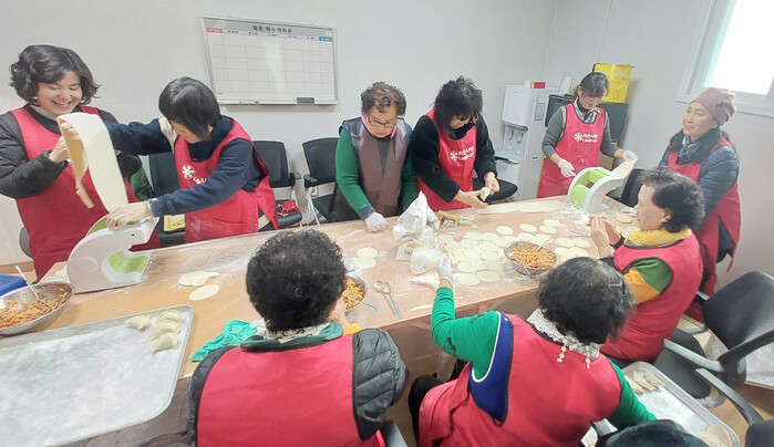 경기 이천시 설성면 작은사랑나눔봉사단이 최근 2025년 새해를 맞이해 어려운 이웃들에게 따뜻한 온기를 전하는 ‘만둣국 음식 나눔 행사’를 진행했다. 사진은 봉사단이 만두를 직접 빚고 있는 모습. (사진=이천시청 제공)