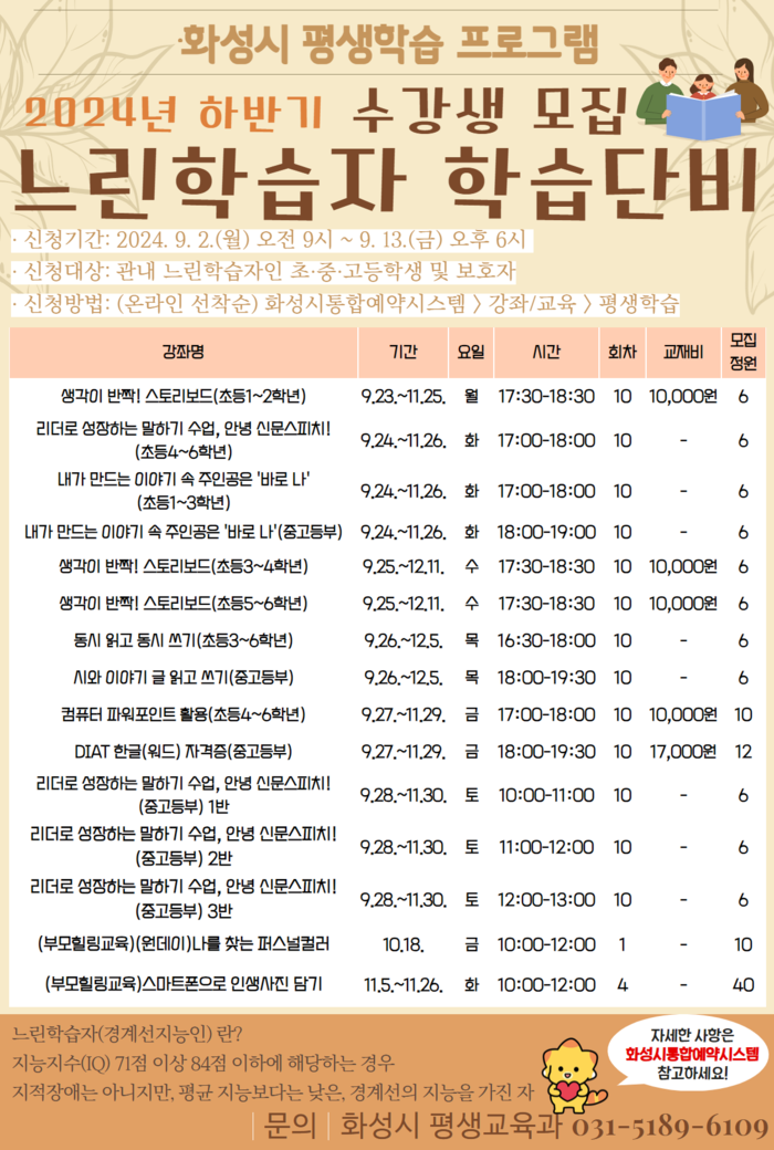 [화성=김정수 기자] 경기 화성시가 2일부터 13일까지 느린학습자를 위한 평생학습 프로그램 ‘2024년 하반기 느린학습자 학습단비’ 수강생을 선착순으로 모집한다.